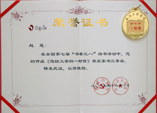 全國第七屆“書香三八”讀書活動啟動后,冶煉分公司工會高度重視,以“爭做讀書先鋒·逐夢幸福云錫”為活動主題,將讀書活動與提升女職工素質(zhì)緊密結(jié)合、與引導(dǎo)女職工崗位建功緊密結(jié)合,廣泛動員女職工積極參加讀書活動。讀書活動得到了全司廣大女職工的積極響應(yīng)和熱情參與,冶煉分公司工會在對征集到的44篇作品審核的基礎(chǔ)上,向控股公司選送了7篇作品參賽。經(jīng)全國“書香三八”讀書活動組委會評審,冶煉分公司女職工趙薏的作品《寫給父親的一封信》榮獲家書三等獎,周波的作品《當(dāng)我開始愛自己》榮獲征文優(yōu)秀獎。