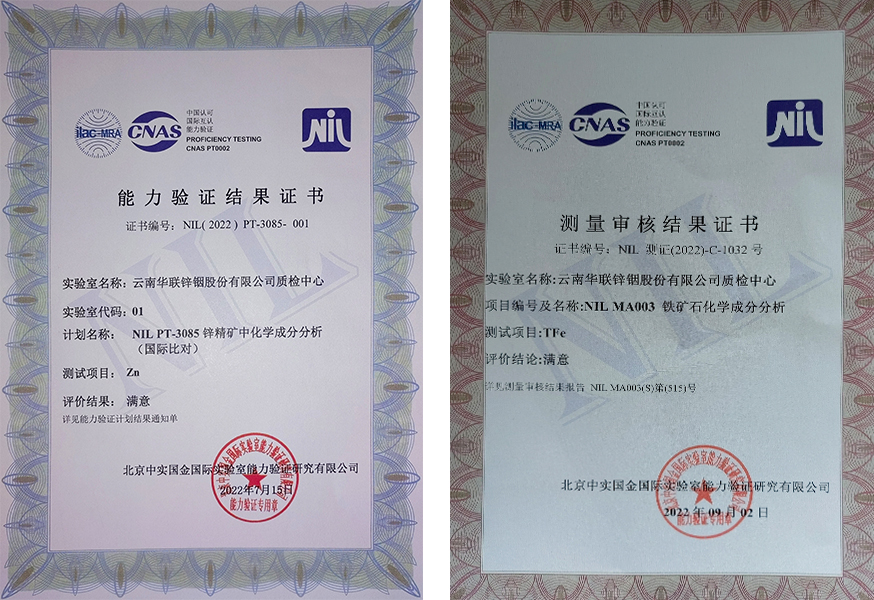華聯鋅銦公司質檢中心于2022年5月參加北京中實國金實驗室能力驗證研究有限公司申報的國家級實驗室認可領域檢測項目,并順利通過鋅精礦、鐵礦石化學成分分析國際檢測認可。此次鋅精礦化學成分分析中Zn能力驗證國際比對,鐵礦石化學成分分析TFe測量審核,雙雙獲得評價結果為滿意的證書。