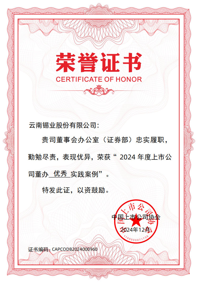 近日,在中國上市公司協會舉辦的“上市公司董辦最佳實踐”案例征集活動中,錫業股份成功入選“2024年度上市公司董辦優秀實踐案例”。