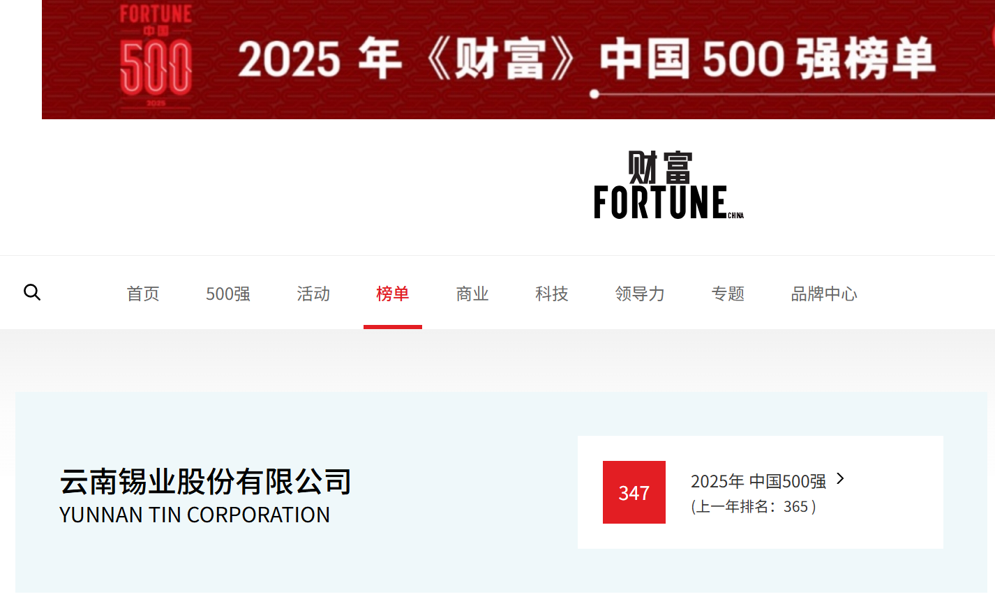 7月22日,2025年《財富》中國500強排行榜發布,錫業股份位居第347位,較去年排名上升18位。