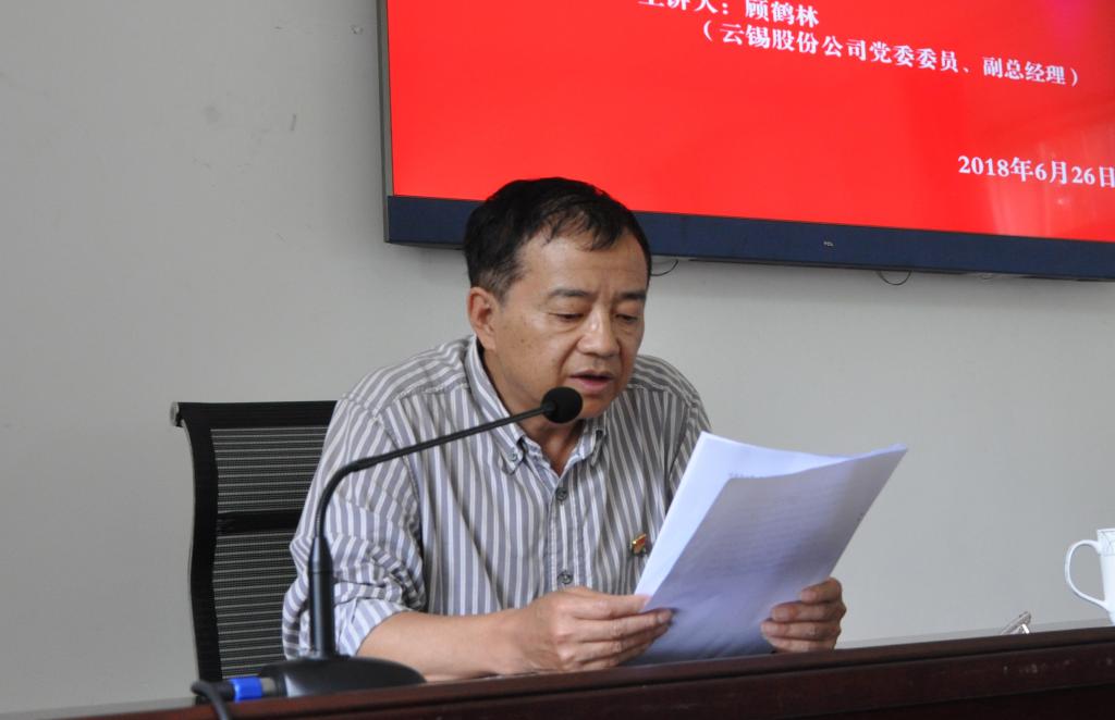 6月26日,錫業股份黨委委員、副總經理顧鶴林結合錫化工產業發展的實際,圍繞如何“學懂弄通做實”十九大精神,以《踐行十九大精神、做新時代黨員》為主題,為化工材料分公司的黨員干部講了一堂黨風廉政建設專題黨課。