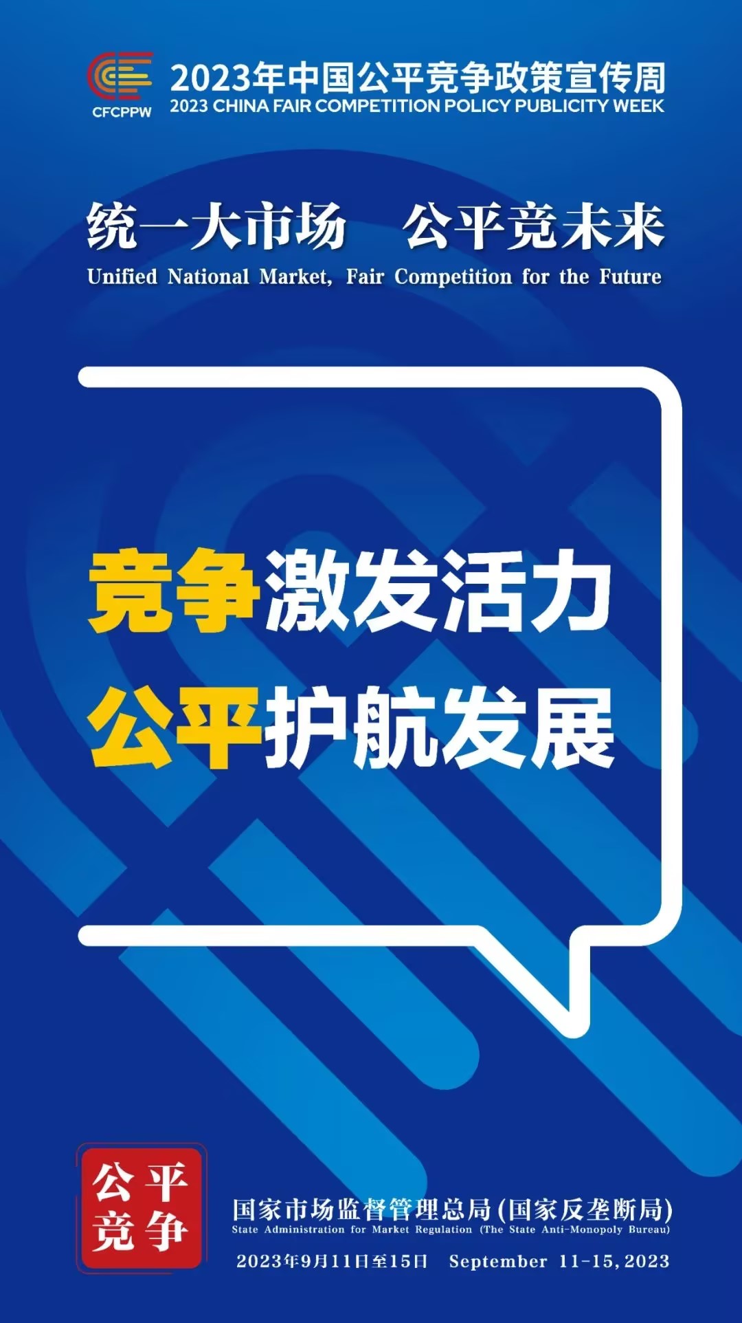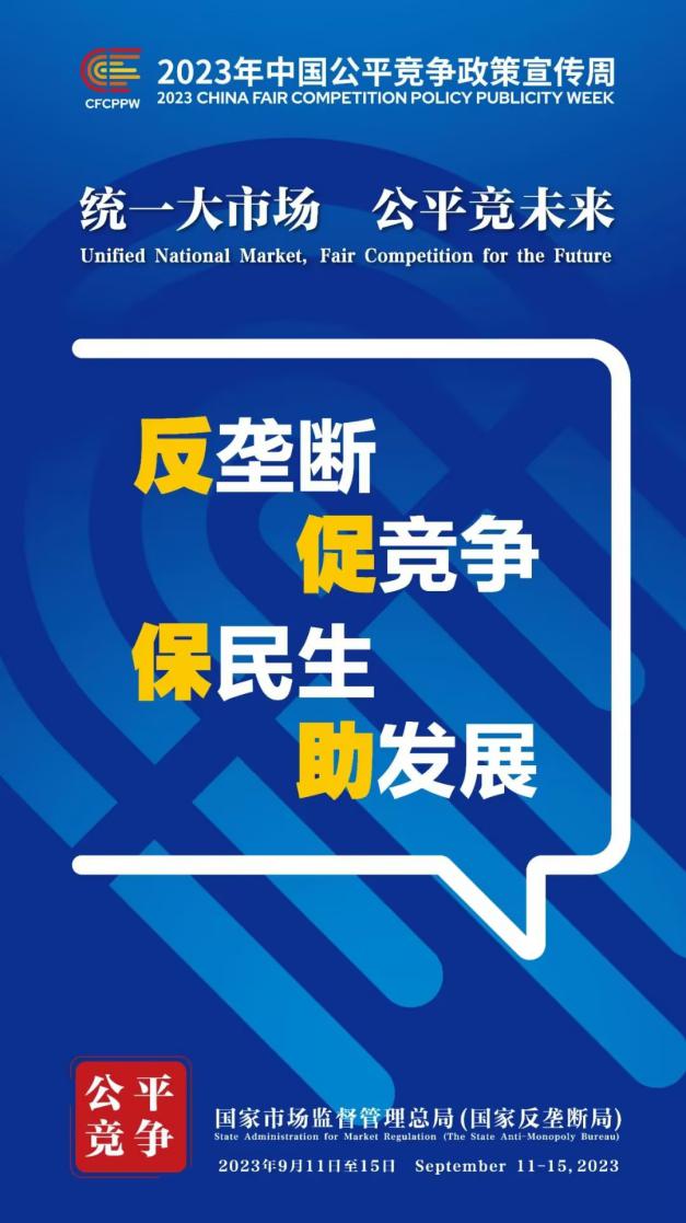 9月11日至15日為2023年中國公平競爭政策宣傳周,主題是“統(tǒng)一大市場 公平競未來”。旨在大力加強公平競爭宣傳倡導,讓公平競爭理念更加深入人心、公平競爭文化更加蔚然成風,為加快建設(shè)全國統(tǒng)一大市場、優(yōu)化市場化法治化國際化一流營商環(huán)境、推動高質(zhì)量發(fā)展營造良好社會氛圍。